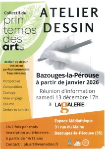 Un atelier de dessin est prévu pour janvier 2026, qui comprendra une séance de questions réponses sur le déroulement de ces ateliers. Une réunion d’information se tiendra le samedi 13 décembre à 17h à la Médiathèque de Bazouges la Pérouse, situé au 31, rue du Maine.
